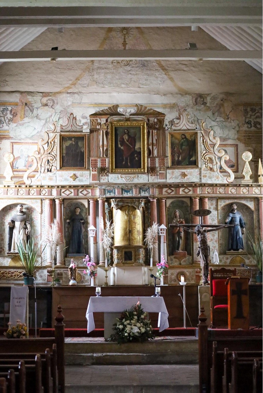Uno de los rasgos más evidentes del mestizaje cultural está en la iconografía de los murales. Las imágenes que adornan los muros de la iglesia no son simples copias de estampas europeas. Tienen detalles que delatan otra mirada, otras manos, otro sentir.